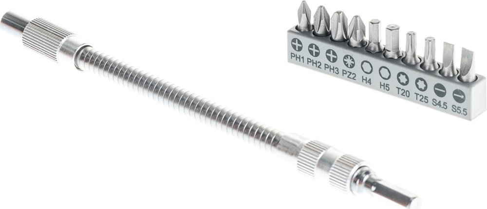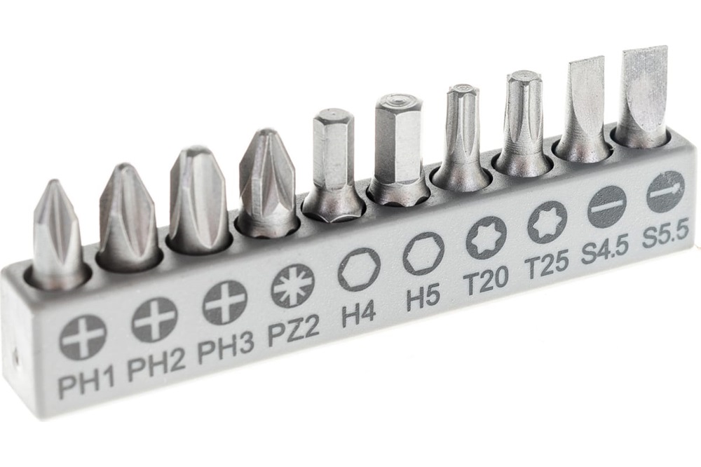PH1, PH2, PH3, PZ2, Hex4, Hex5, T20, T25, SL 0,6 x 4,5; SL 0,8 x 5,5